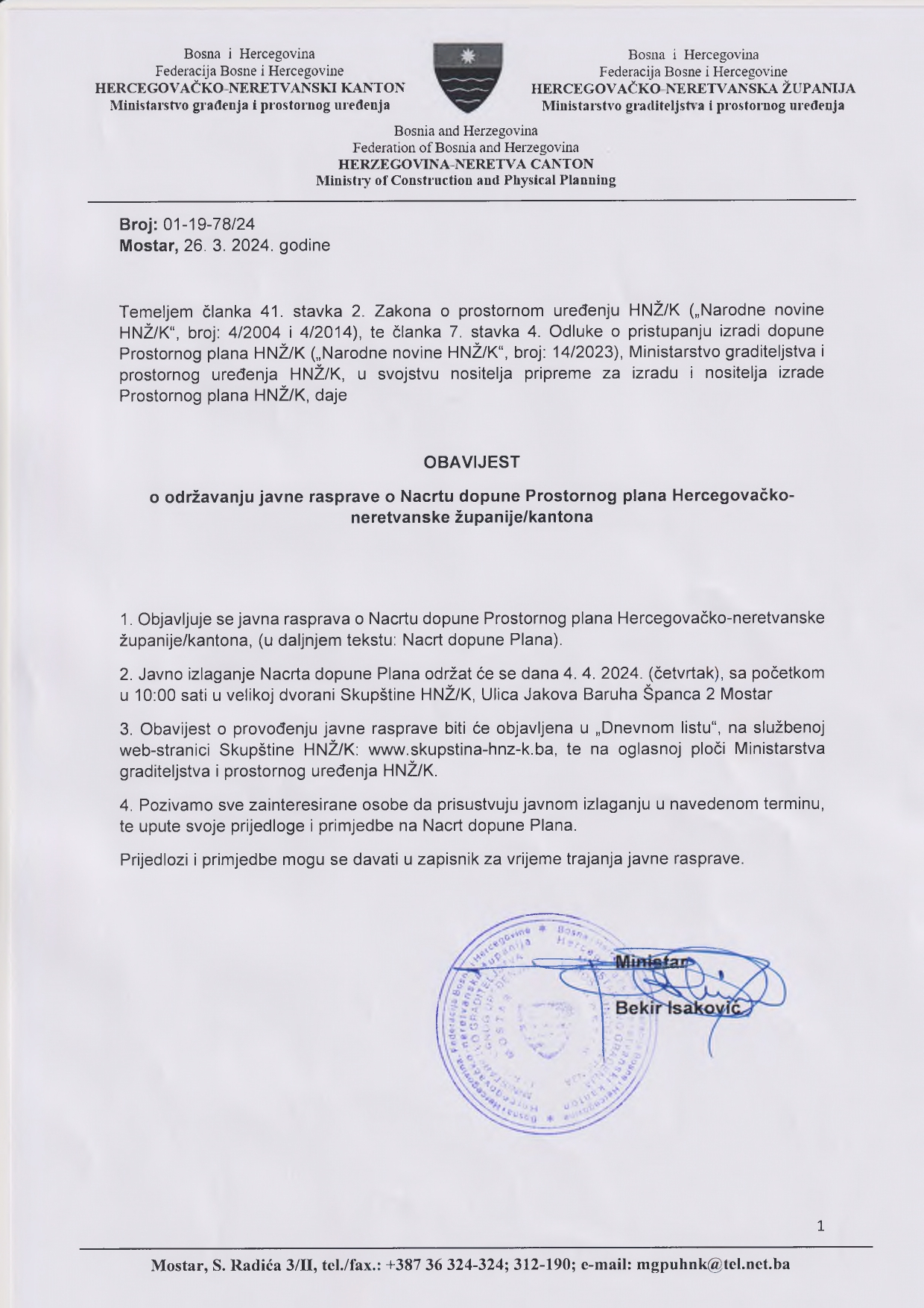Јавно излагање Нацрта допуне Плана одржат ће се дана 4. 4. 2024. (четвртак), са почеткому 10:00 сати у великој сали Скупштине ХНК, Улица Јакова Баруха Шпанца 2 Мостар.